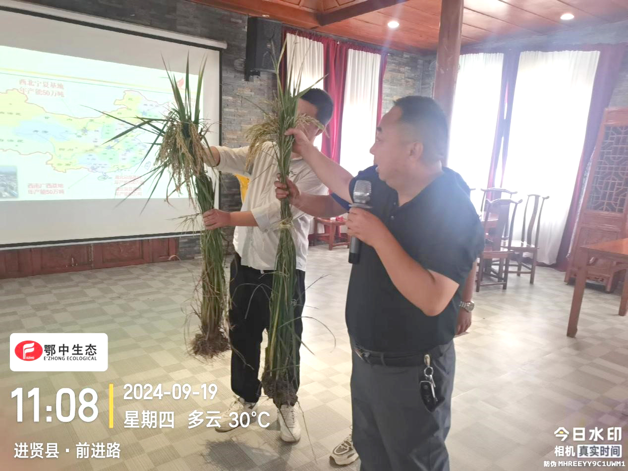 種植戶俞有才激動地分享著自己的“第一次”嘗試——今年,他首次使用了2噸鄂中仟金方42%(22-8-12)微生物生態(tài)復合肥,這一決定源自別人的“說者無心”,他的“聽者有意”。俞有才巧妙地設置了“田間實驗室”,在道路兩側(cè)的水稻田里,一邊施用鄂中仟金方,另一邊則是傳統(tǒng)肥料。現(xiàn)場,兩株水稻的直觀對比,是最直接的證言:鄂中仟金方孕育出來的水稻,葉片如扇,翠綠欲滴,分蘗茂盛,幾乎是對照田的兩倍;抽穗飽滿,數(shù)量更是多出1/3,在場的農(nóng)戶紛紛贊嘆不已。