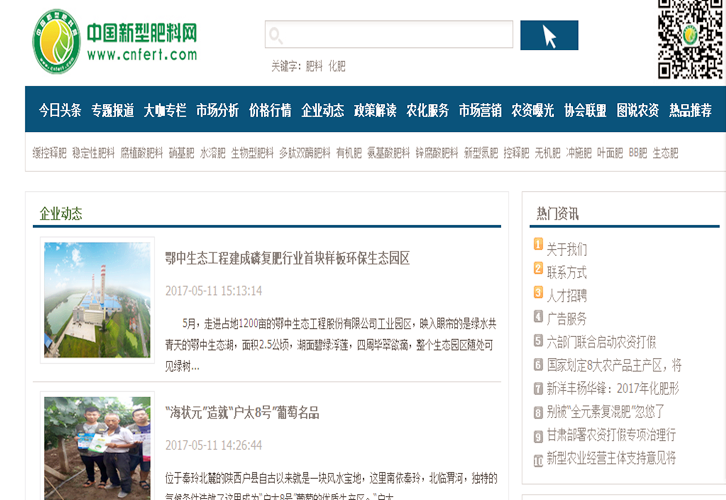 《鐘祥市政府網站》、《中國新型肥料網》5月11日:鄂中生態工程園區建成磷復肥行業首塊樣板環保生態園區