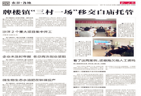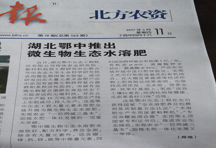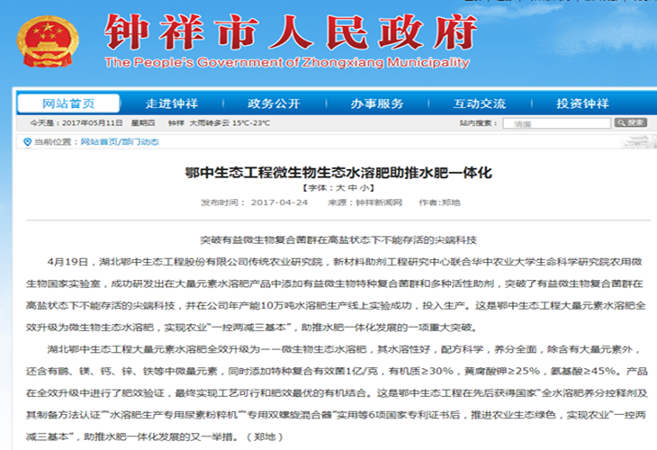 《北方農(nóng)資》.《荊門晚報》.《鐘祥市政府網(wǎng)站》.《鐘祥新聞網(wǎng)》:鄂中生態(tài)工程微生物生態(tài)水溶肥助推水肥一體化