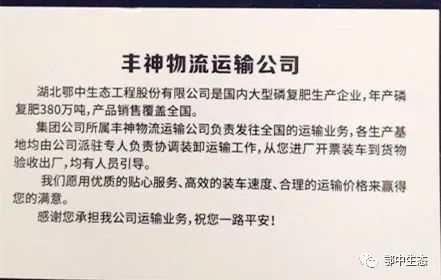 豐神物流人還在不斷拓寬服務寬度和深度,服務的拓展囊括了物流、商流、資金流、信息流等各個部分。他們制作了精美的物流信息卡片,在物流公司方圓10公里范圍內,不畏風雪嚴寒向因大雪封路而臨時停靠的貨車司機發放公司物流信息卡片。僅1月5日一天,就發放信息卡2000余張。