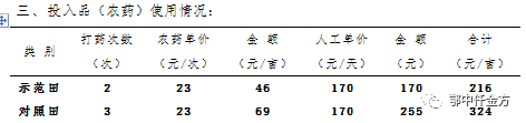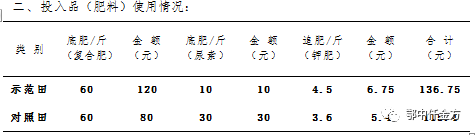 經過鄂中農化專員、農技專家多點匯總測定分析:鄂中仟金方微生物生態復合肥示范田肥料投入為136.75元/畝,農藥及人工投入為216元,共計352.75元/畝;對照田肥料投入為115.4元/畝,農藥及人工投入為324元,共計439.4元/畝。與對照田相比,鄂中仟金方示范田較少投入86.65元/畝。施用鄂中仟金方含量32%(19-5-8),對照田肥料含量為51%(17-17-17),與對照田相比,化肥減量43.1%。