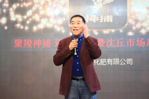湖北浩斯特化肥有限公司總經理助理蔡建新宣布“神捕”沈丘市場啟動儀式圓滿成功