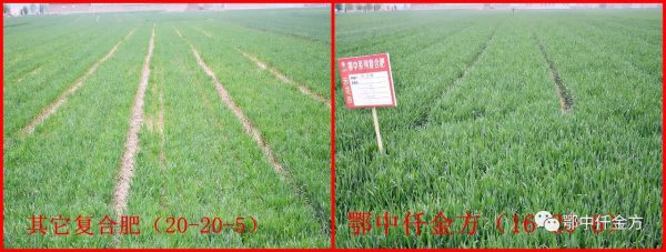 (3)抗病省事:施用鄂中仟金方的小麥地?zé)o白粉病、赤霉病、紋枯病、根腐病等病害,對(duì)比田出現(xiàn)大面積葉腳發(fā)黃;比對(duì)照田少澆一次水,少打一次農(nóng)藥。